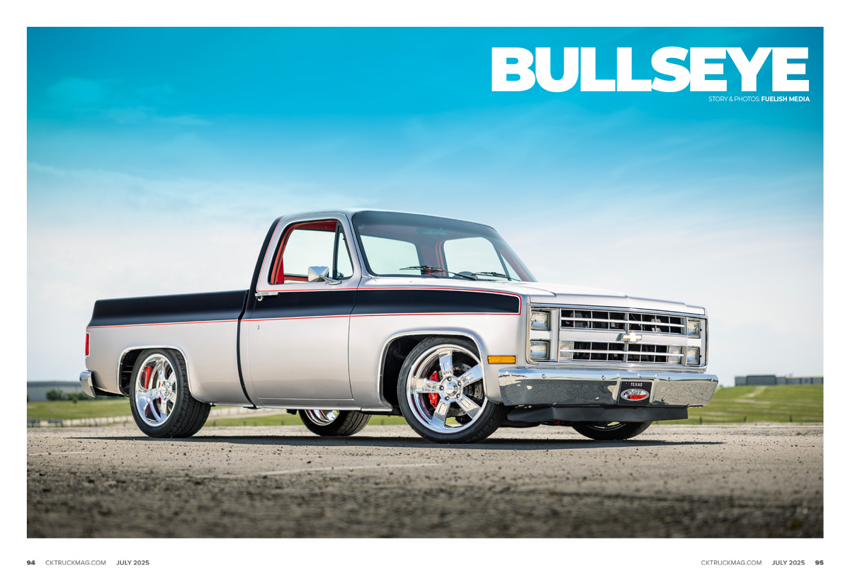 Even though the ’85 was in decent enough shape when Micah found it, it still required a full round of necessary bodywork to prep every panel for paintwork. Aside from the routine chore of correcting every ding and dent, The Crue also jumped into the process of shaving the drip rails, cab seems, and stake pockets. These custom subtleties, along with flush-mounted front and rear glass from Fesler, create the sleek, streamlined look that appeal to Micah’s aesthetic. After the metalwork was complete, Jason Hill then loaded up his paint gun and applied the combination of PPG Sterling and black colors to create a timeless two-tone paint scheme. He then applied red pinstriping to provide a welcomed contrast to the cool hues. From there, a batch of OEM replacement pieces from the bumpers to the grille, were assembled and affixed to the body.