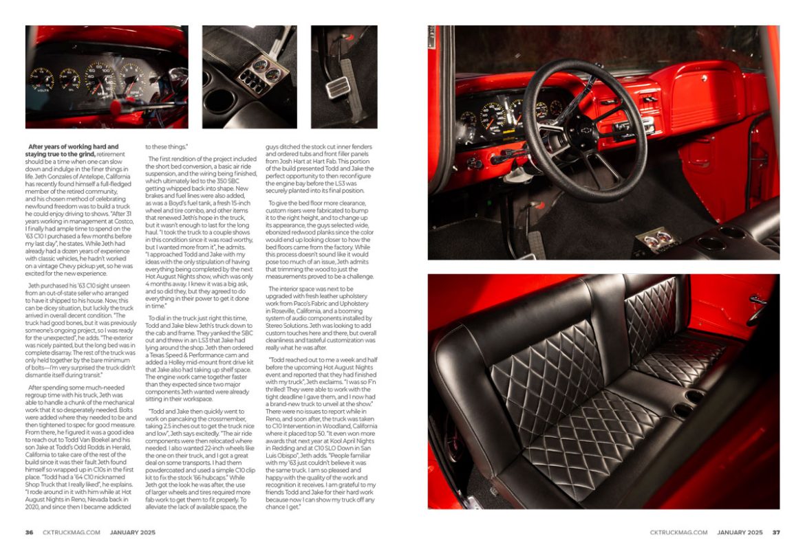 “Todd reached out to me a week and half before the upcoming Hot August Nights event and reported that they had finished with my truck”, Jeth exclaims. “I was so F’n thrilled! They were able to work with the tight deadline I gave them, and I now had a brand-new truck to unveil at the show.” There were no issues to report while in Reno, and soon after, the truck was taken to C10 Intervention in Woodland, California where it placed top 50. “It even won more awards that next year at Kool April Nights in Redding and at C10 SLO Down in San Luis Obispo”, Jeth adds. “People familiar with my ‘63 just couldn’t believe it was the same truck. I am so pleased and happy with the quality of the work and recognition it receives. I am grateful to my friends Todd and Jake for their hard work because now I can show my truck off any chance I get.”