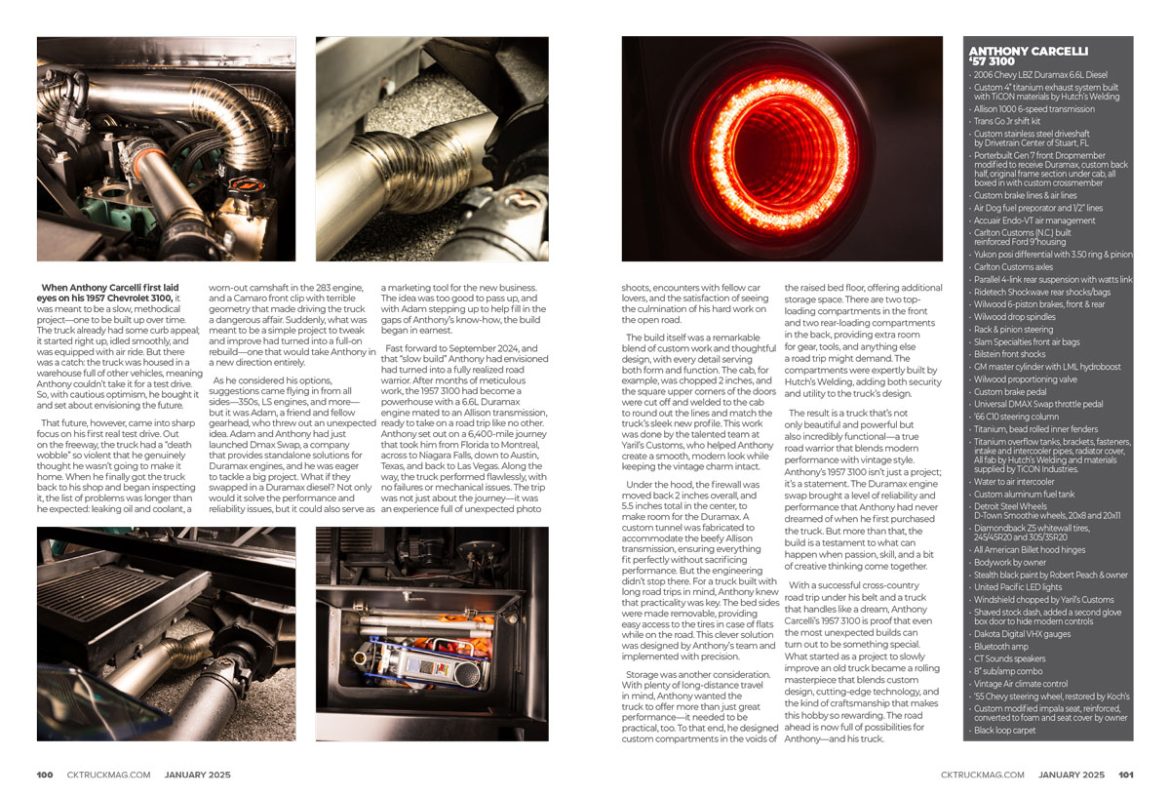 With a successful cross-country road trip under his belt and a truck that handles like a dream, Anthony Carcelli’s 1957 3100 is proof that even the most unexpected builds can turn out to be something special. What started as a project to slowly improve an old truck became a rolling masterpiece that blends custom design, cutting-edge technology, and the kind of craftsmanship that makes this hobby so rewarding. The road ahead is now full of possibilities for Anthony—and his truck.