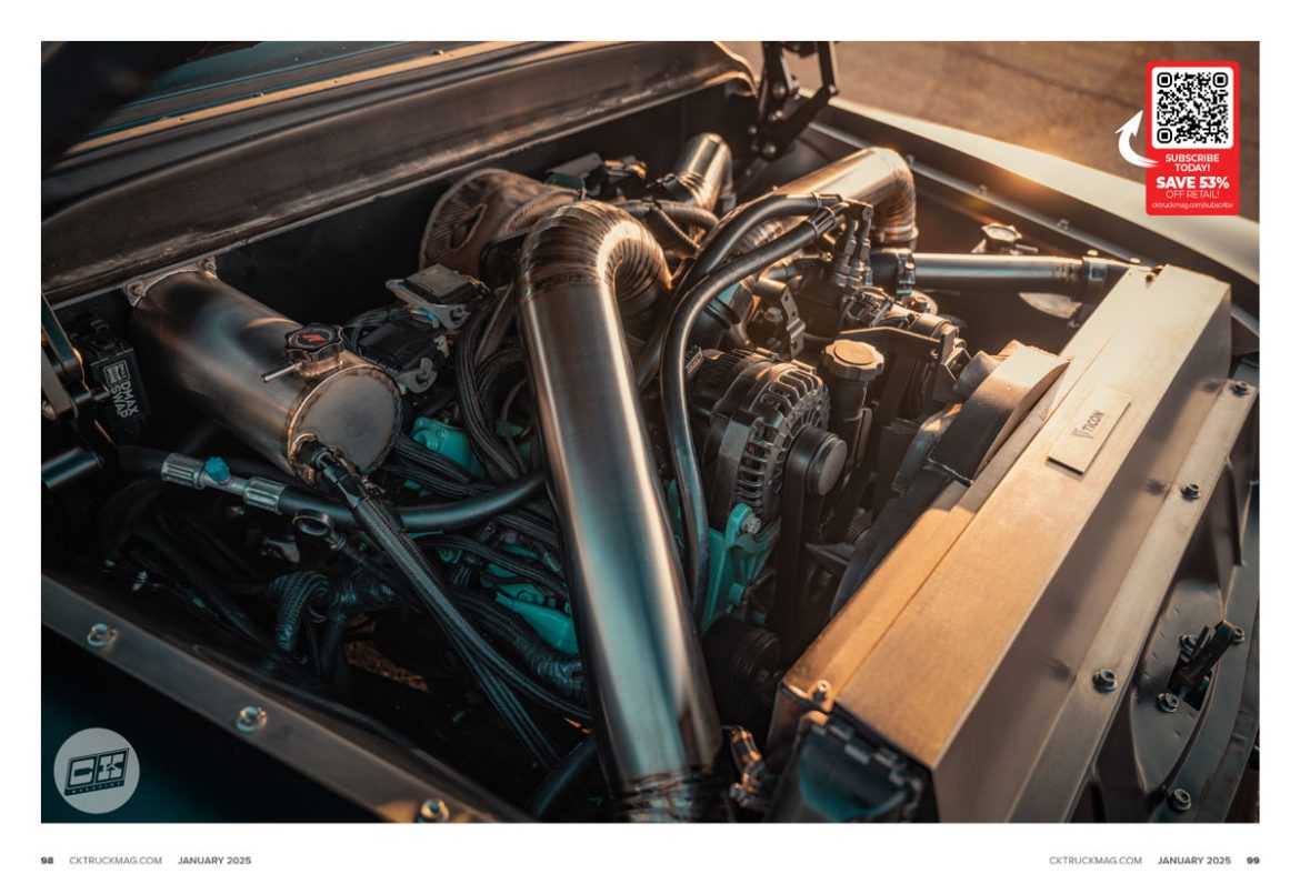 Under the hood, the firewall was moved back 2 inches overall, and 5.5 inches total in the center, to make room for the Duramax. A custom tunnel was fabricated to accommodate the beefy Allison transmission, ensuring everything fit perfectly without sacrificing performance. But the engineering didn’t stop there. For a truck built with long road trips in mind, Anthony knew that practicality was key. The bed sides were made removable, providing easy access to the tires in case of flats while on the road. This clever solution was designed by Anthony’s team and implemented with precision.